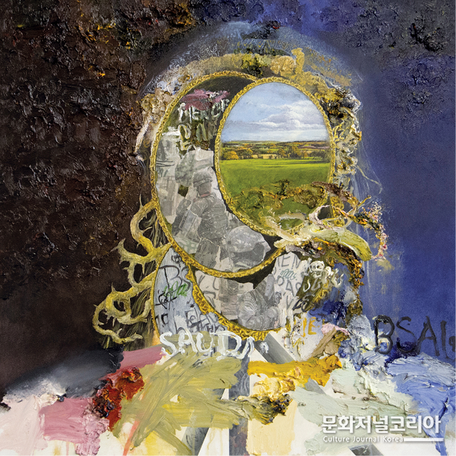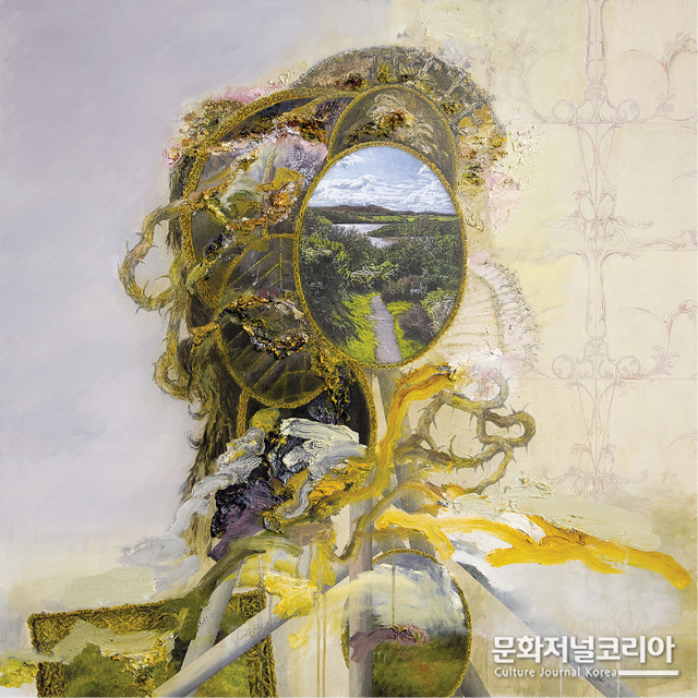 얼굴/머리를 대체하는 거울 프레임 속에는 아름답고 평온한 자연의 풍경이 사실적으로 그려져 있으며, 이를 제외한 주변부는 복잡하게 나열된 선과 정돈되지 않은 색, 한 눈에 이해하기 어려운 문구들이 어수선하게 배치되어 특정 지을 수 없는 추상적 표현의 덩어리로서 존재한다.