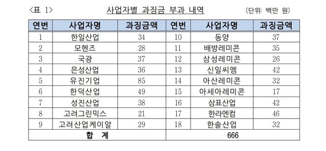 25일 공정위에 따르면 총 18개 사업자에는 시정명령과 과징금 6억6600만원, 천안아산레미콘협의회에는 시정명령과 과징금 400만원을 각각 부과했다. 천안아산레미콘협의회는 천안·아산지역 18개 레미콘 제조·판매 사업자들이 구성한 사업자단체다.
