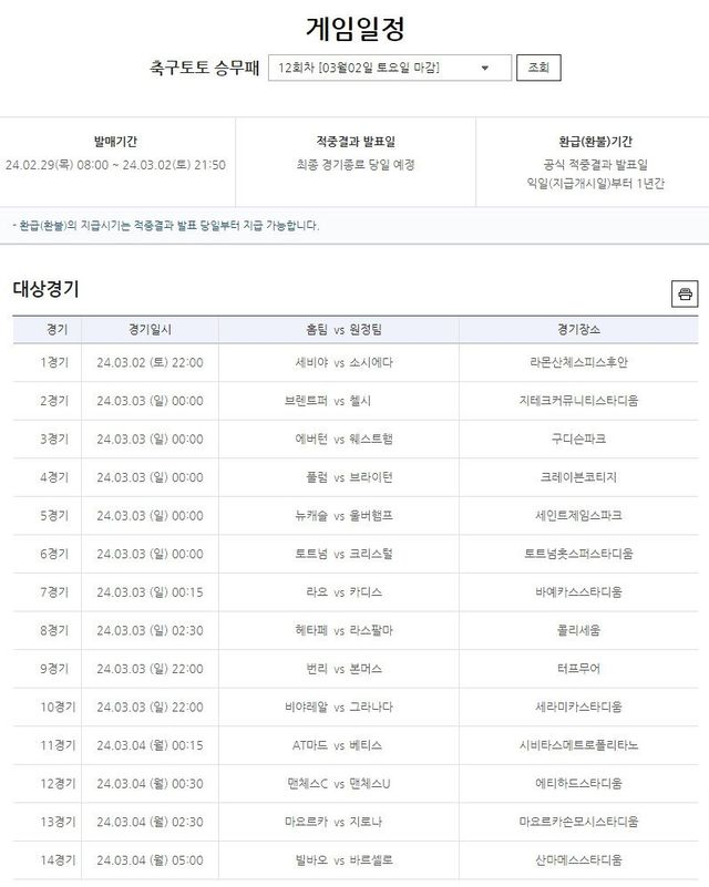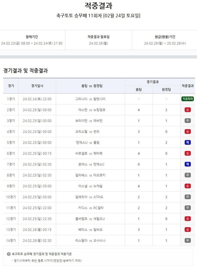 한편 축구토토 승무패 11회차 적중에 성공한 축구팬들은 2025년 2월 26일(수)까지 1년 이내 전국 토토판매점 또는 우리은행 지점에서 적중금을 찾아갈 수 있으며, 이어지는 축구토토 승무패 12회차 게임은 오는 29일(목) 오전 8시부터 구매가 가능하다.