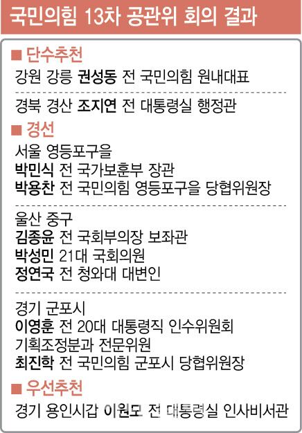 강원 강릉엔 현역인 권성동 의원이 단수추천을 받으며 5선에 도전한다. 현역인 윤두현 의원이 불출마를 선언한 경북 경산엔 조지연 전 대통령실 행정관이 경선 진출을 확정했다. 조 전 행정관은 총선에서 무소속으로 출마한 최경환 전 경제부총리와 맞붙을 예정이다.