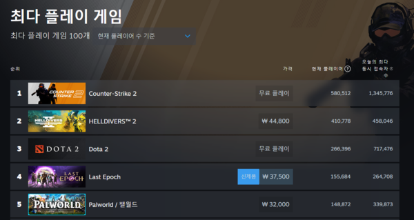 26일 ‘라스트 에포크’는 스팀 전세계 최고 판매 제품 순위 4위 자리를 차지하고 있으며, 일일 최다 동시 접속자 수는 약 26만 명을 기록하고 있다. 인기 순위에서 ‘라스트 에포크’보다 높은 자리에 있는 게임은 ‘헬다이버즈2’, ‘카운터 스트라이크2’ 등 스팀 최고 히트작들만이 위치하고 있으며, 이용자 수 또한 스팀 10위권 이내를 꾸준히 지키고 있다.