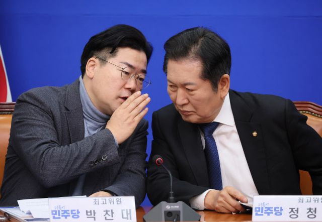 박찬대 더불어민주당 최고위원(왼쪽)과 정청래 최고위원이 국회에서 열린 최고위원회의에서 대화하고 있다. (사진=연합뉴스)