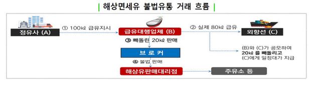 하지만 조사대상에 오른 급유대행업체는 외항선박과 짜고 정유사로부터 지시받은 해상면세유를 전량 급유하지 않고 일부를 빼돌리는 수법을 썼다. 예를 들어 정유사는 100㎘의 급유지시를 했으나, 급유대행업체는 외항선박과 공모해 이중 80㎘만 주유하고 나머지 20㎘는 브로커를 통해 불법 유통하는 것이다. 빼돌린 해상면세유는 주로 해상유 판매대리점 등에서 불법 거래된다.