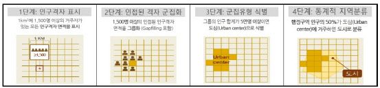 통계적 지역분류를 위해서는 우선 가로 1㎞, 세로 1㎞의 공간 안에 1500명 이상이 살고 있을 경우 ‘인구격자’를 표시한다. 이후 한 격자와 인접한 격자가 있다면 이를 한 군집으로 묶고, 군집화 규모에 따라 △도심(격자내 인구 1500명 이상, 군집화 인구 5만명 이상) △도시 클러스터(격자내 인구 300명 이상, 군집화 인구 5000명 이상) △농촌 (도심과 도시클러스터 외 지역) 3개로 나눈다.