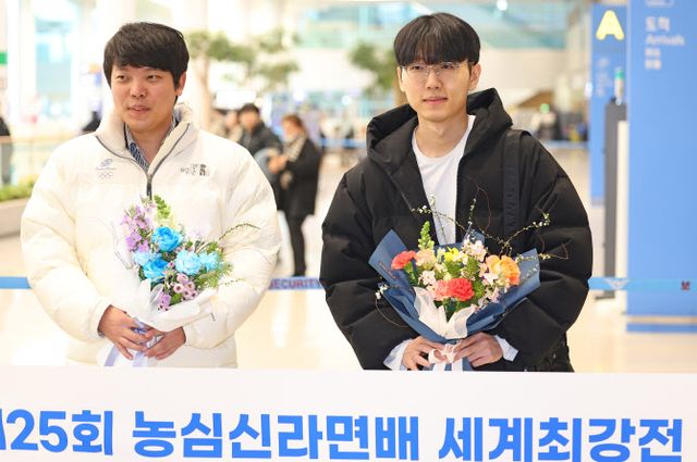 | 중국 상하이에서 열린 제25회 농심신라면배 세계바둑최강전에서 한국의 대회 4연패를 견인한 신진서 9단이 24일 오후 인천국제공항 제2여객터미널을 통해 귀국해 홍민표 감독과 함께 기념촬영을 하고 있다(사진=연합뉴스). |