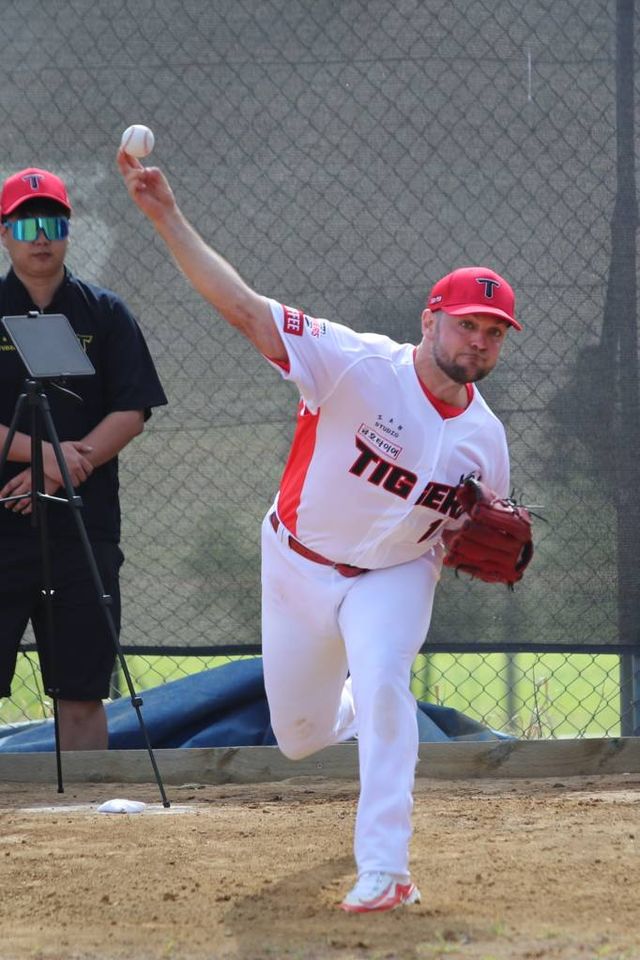 KIA 외국인 투수 윌 크로우가 스프링캠프 연습경기 등판으로 구위를 점검한다.