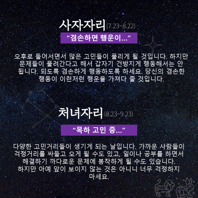 정신적, 육체적 건강을 회복하는데 주력해야 하는 때입니다. 주변 환경 탓을 하면 움츠러들어서는 안 됩니다. 그럴 때일수록 가슴을 쫙 펴고 크게 심호흡을 해보도록 하세요. 특히 위장이 나빠질 수 있으니 주의가 필요합니다.