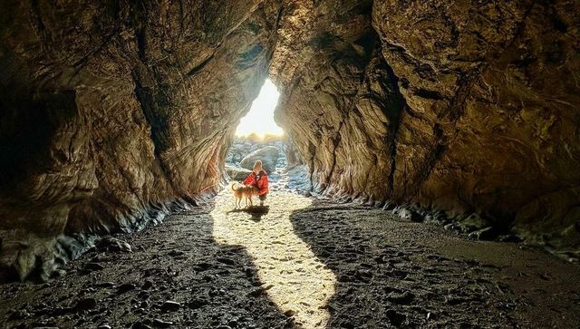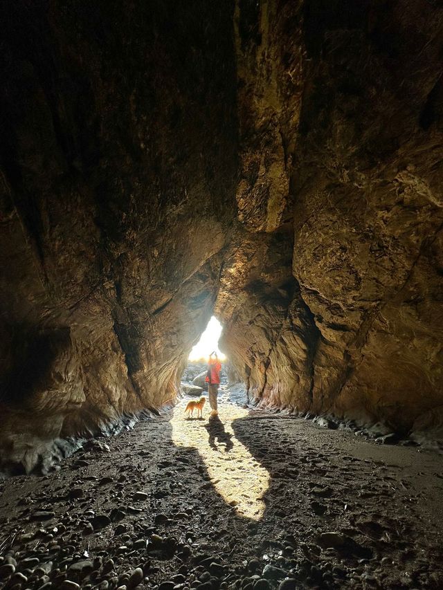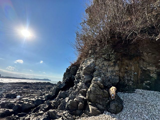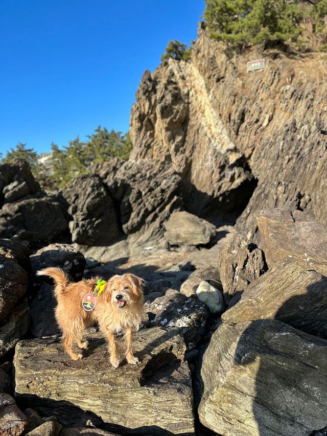 솔향기길 1코스의 하이라이트는 중막골에서 꾸지나무 해수욕장 사이에서 만나는 용난굴이다. 기암이 유명한 바다에 가면 늘 듣는 ‘용이 나와 승천한 곳’이 유래. 거친 파도가 맹렬하게 들이치는 소리를 배경 삼아 동굴 안까지 이어진 길이 비범하다. 동굴 안으로 18m 정도 들어가면 그 끝이 두 개의 작은 굴로 나누어지는데, 용난굴에서 20m 거리에 있는 별쌍금캠핑장 사장님 말에 따르면 용 두 마리의 머리가 있던 자리다. 우측 용이 먼저 승천했고, 좌측에 자리 잡았던 용은 승천하지 못해 피를 쏟으며 돌이 되었다는 이야기가 이어진다. 용의 망부석 주변으로 곰바위, 거북바위가 멋진 조각을 뽐낸다. 동굴 안쪽에서 바깥쪽을 바라보면 빛이 한 줄기 조명처럼 떨어지는데, 이 자리가 이른바 견생샷 스폿. 반려견을 번쩍 들어 ‘라이온킹’의 한 장면처럼 추억 사진을 남겨보자. 마지막으로 갯바위가 이국적인 꾸지나무 해수욕장에서 반려견과 ‘우다다’ 세러머니로 마무리!