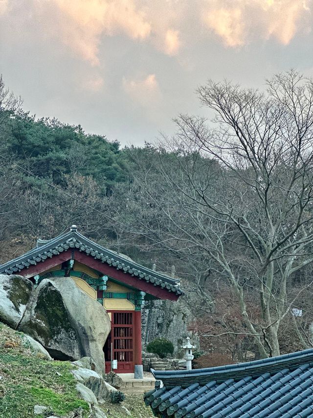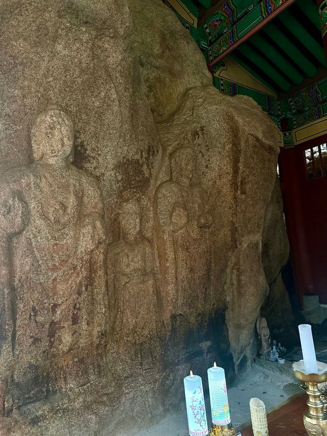 영화 〈파묘〉의 인기와 더불어 민족 문화에 관한 관심이 큰데, 태안 백화산이 품는 토속 신앙의 흔적이 흥미롭다. 육중한 기암과 소나무가 어우러진 높이 284m의 산은 언뜻 평범해 보이지만, 동문리 진입로에 있는 태을암에서부터 백제의 보물, 마애삼존불을 만난다. 석가여래, 관세음보살, 약사여래로 알려진 삼존상은 6세기에 만들어졌지만, 불상의 자세나 장신구, 연꽃 대좌는 여전히 선명한 그림자를 만든다. 서해의 작고 낮은 바위산에 천 년도 훨씬 넘은 불상이 사람들을 불러 모으고 있는 풍경이 놀랍다.