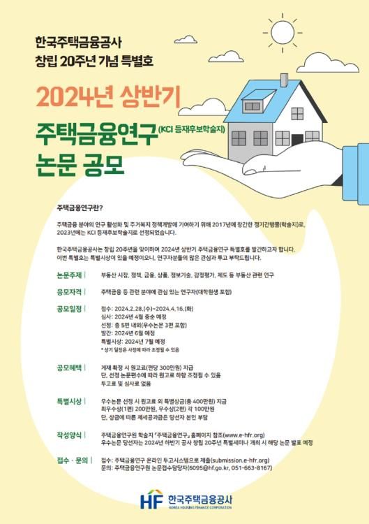 [폴리뉴스 정주영 기자] 한국주택금융공사(HF, 사장 최준우)는 창립 20주년을 기념하여 2024년 상반기 ‘주택금융연구’ 특별호 논문 공모를 실시한다고 28일 밝혔다.