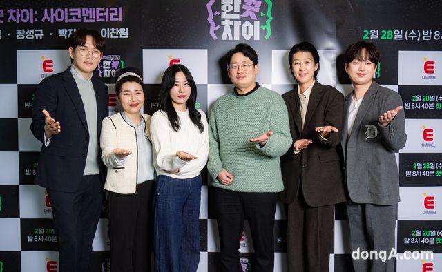 28일 '한 끗 차이: 사이코멘터리' 제작발표회에는 박지선 교수, 홍진경, 장성규, 이찬원, 그리고 E채널 박소현 PD와 스토리웹 박경식 PD가 참석했다.
