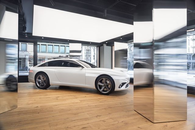 ‘역동적인 우아함(Athletic Elegance)’에서 영감을 받은 몰입형 스튜디오는 방문객이 설치물의 일부가 되면서 공간과 원활하게 조화를 이루도록 설계됐다. 천천히 회전하는 거울은 끊임없이 변화하는 이미지와 시점으로 가득한 무한히 긴 공간을 지나며 콘셉트카와 관객 사이의 연결을 만들어낸다.