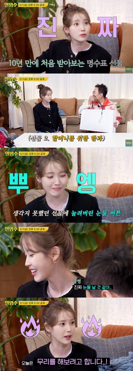 이어 "할머니 계시지?"라면서 아이유의 할머니를 위한 한과 선물을 꺼내들었다. 아이유는 "할며니 드려"라는 박명수의 말에 "눈물날 것 같다"며 말을 금치 못했다.