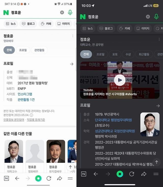 실제로 29일, 네이버에 ‘정호윤’으로 검색한 결과 최상단에 대학교수, 전 공무원으로 프로필 정보가 제공되고 있다.