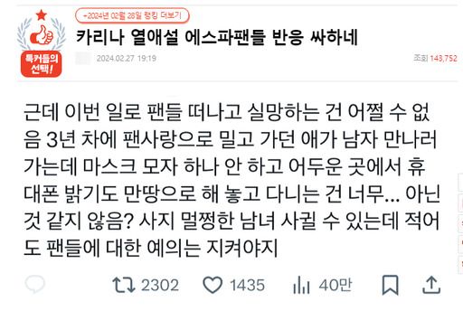 카리나 열애설 반응 게시글 (출저= 인터넷 커뮤니티 네이트 판 캡쳐)