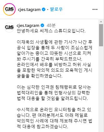 29일 씨제스 스튜디오 측은 "이재욱의 사생활에 관한 기사가 나간 후 공식입장을 통해 두 사람이 조심스럽게 알아가는 중이고 따뜻한 시선으로 지켜봐 주시기를 간곡히 부탁드렸으나, 온라인에서 배우를 비방하고 허위 사실을 포함한 악의적 의도의 모욕적인 게시글들을 확인하였다"라고 밝혔다.