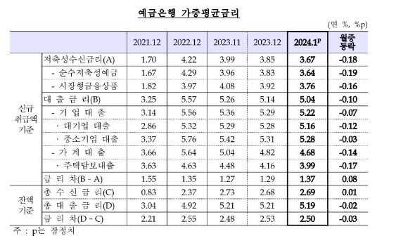 29일 한국은행이 발표한 '2024년 1월 금융기관 가중평균금리'에 따르면 1월 예금은행의 신규 취급액 기준 대출 금리는 연 5.04%로 전월 5.14%보다 0.10%포인트(p) 하락했다.