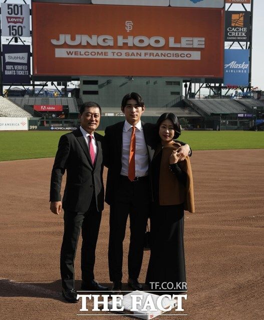 지난해 12월 샌프란시스코 자이언츠와 입단식을 가질 당시 아버지 이종범과 함께 기념 사진을 찍은 이정후./AP.뉴시스
