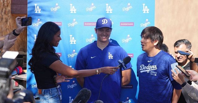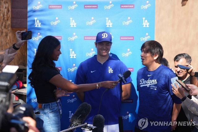 오타니는 1일(한국시간) 미국 애리조나주 글렌데일 캐멀백 랜치에서 열린 미국프로야구 다저스의 스프링캠프 훈련을 앞두고, 미국과 일본 취재진 앞에 섰다.