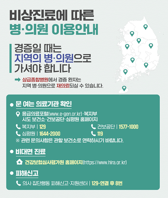 복지부는 “의료공백과 진료차질을 최소화하기 위해 경증환자 분들은 지역의 병의원을 이용해주시고 지자체에서도 이를 적극 안내해줄 것”을 당부했다.