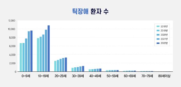 틱 장애 환자 수는 2018년 1만8024명에서 2022년 2만5092명으로 39% 급증했다. 주목할 점은 2022년 2만5092명의 환자 중 19세 미만 환자 수가 2만457명으로 전체 환자 수의 80%를 넘는다.