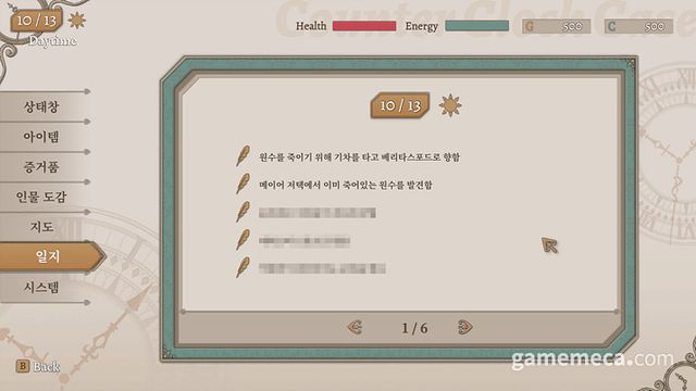 다만 끊임없이 달라지는 살인사건과 변수를 더하는 주사위 판정으로 같은 상황이 급변하는 일을 여러 번 겪다 보면, 필연적으로 정보를 받아들이는 부분에 혼란이 생기는 경우가 발생한다. 해피슬럭스는 이를 방지하기 위해 등장인물 기본 정보를 확인할 수 있도록 했고, 필요 시 노트를 작성할 수 있는 기능도 추가했다. 아울러 일지에서는 스토리 진행에 따라 자동으로 플레이어 행동을 기록해주고, 캐릭터 스테이터스 란에서는 현재 평판과 지금 해야 하는 일 등에 대한 힌트를 확인할 수 있다.