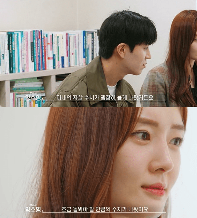 이후 두 사람의 갈등을 듣던 부부 상담사는 김영걸에 대해서 "영걸 님은 조증에 화병이 있다. 매사 못 참고 너무 조급해져 있다. 늘 화난 사람이 되다 보니까 화를 낼 때도 폭발할 듯이 낸다"고 말을 이었고, 아름에 대해서는 "심리 상태가 심각하다"며 "자살 수치가 정신병원에 입원해 돌봐야 할 수준이다."라고 우려를 표하기도 했습니다.