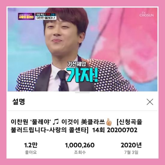 지난 2020년 7월 TV조선 유튜브 공식 계정에는 "[신청곡을 불러드립니다–사랑의 콜센타] 14회 2020702 방송"이라는 제목의 영상이 게재됐다.