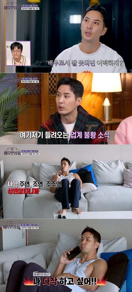 그는 다른 배우들이 한해 6개, 7개 작품을 했다면서 자신이 단 한 작품 됐다고 비교했다. 이를 스튜디오에서 지켜보던 김지석은 "관계자들이 올해 경기가 너무 안 좋을 거란 이야기를 많이 들었다"면서 "그래서 안한다는 말은 안 된다. 그래도 하고 싶다"고 간절한 마음을 엿보였다.