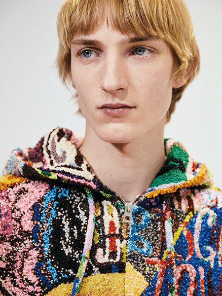그뿐만 아니라 호킨스의 작품은 주얼리, 의상 프린트, 니트 자카르, 스퀴즈 백과 퍼즐 폴드의 자수, 레더 인타르시아, 글라스 스터드, 프린지 등 다채로운 디테일로 재탄생되었다. 무엇보다 그의 그림이 전면 프린트된 디테일을 자세히 살펴봐야 한다. 후드 집업과 조거 팬츠, 스퀴즈 백은 글라스 스터드를 촘촘하게 채워 작품을 수놓았고, 니트 원피스는 마치 붓 터치를 살려낸 유화처럼, 짜임새가 다른 니트를 조각조각 이어 붙여 작품을 완성시켰다. 모든 요소들이 호킨스의 콜라주처럼 유기적으로 연결되고 또 해체되기를 반복하는 이번 시즌 로에베는 그 자체가 완전한 하나의 현대미술 작품이었다.