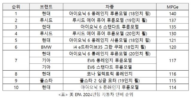 ◇美 EPA 2024년형 연비 순위서 1위