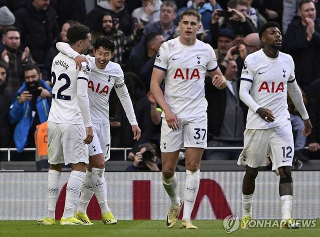 브레넌 존슨(왼쪽) 등 동료들과 득점 자축하는 손흥민 / (로이터=연합뉴스)