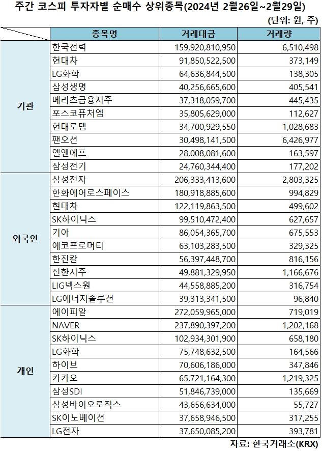 기관 '한국전력'·외인 '삼성전자'·개인 '에이피알' 1위 [주간 코스피 순매수- 2월26일~2월29일]