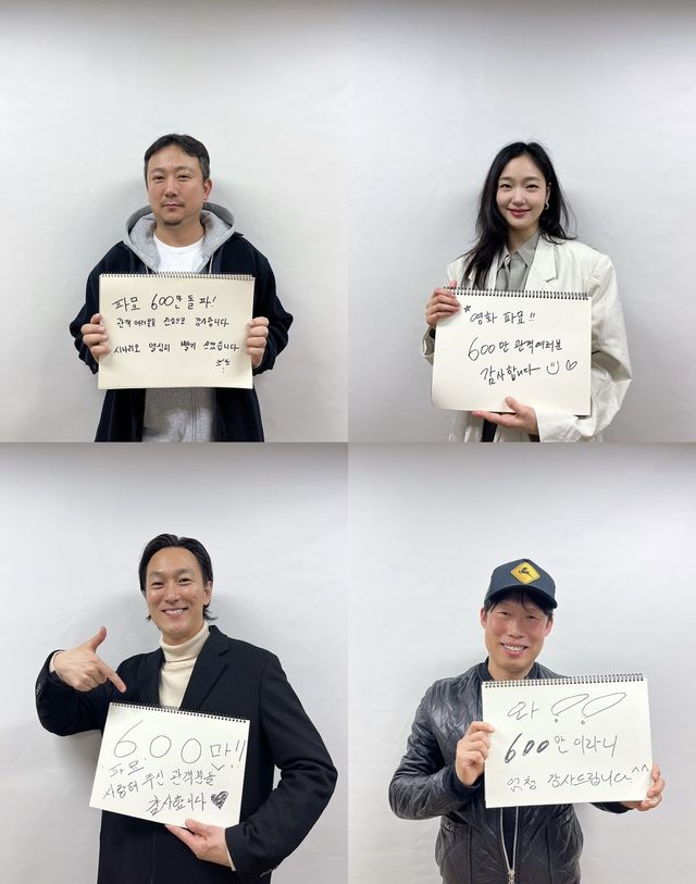 관객들의 사랑에 보답하고자 '파묘' 팀은 자필로 적은 감사 메시지를 공개했다. 544만 관객을 돌파한 전작 '검은 사제들'의 스코어를 뛰어넘으며, 자체 최고 흥행 기록을 경신한 장재현 감독은 “'파묘' 600만 돌파! 관객 여러분들 진심으로 감사합니다. 시나리오 열심히 빨리 쓰겠습니다”라며 재치 있게 감사를 전했다. 이어 프로페셔널한 연기 호흡으로 몰입도를 높이며 극의 재미를 끌어올린 최민식, 김고은, 유해진, 김재철 배우가 관객들에게 친필 메시지로 감사 인사를 전했다. 최민식은 “'파묘'!! 600만이라니… 감사합니다!!”, 김고은은 “영화 '파묘'!! 600만 관객 여러분 감사합니다”, 유해진은 “와!! 600만이라니 엄청 감사드립니다^^”, 김재철은 “600만!! '파묘' 사랑해 주신 관객분들 감사합니다”라며 600만 돌파에 대한 기쁨과 진심 어린 감사를 표현했다.