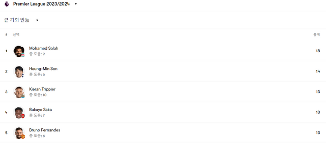 풋몹, 소파스코어 등 각종 통계 매체에 따르면 손흥민은 4일(한국시간) 기준 프리미어리그 전체 빅 찬스 메이킹 순위에서 모하메드 살라(리버풀)에 이은 단독 2위에 위치해 있다.