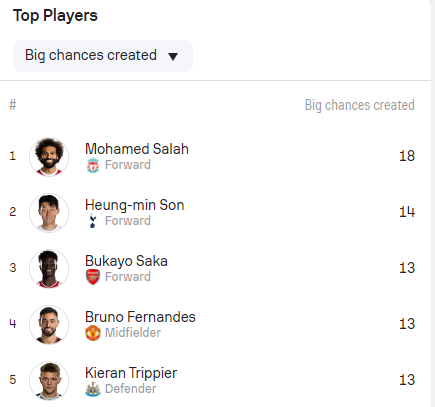 13개의 부카요 사카(아스널), 키어런 트리피어(뉴캐슬), 브루누 페르난데스(맨체스터 유나이티드), 트렌트 알렉산더 아널드(리버풀), 드와이트 맥닐(에버턴)을 제쳤다. 1위는 18개의 모하메드 살라였다.