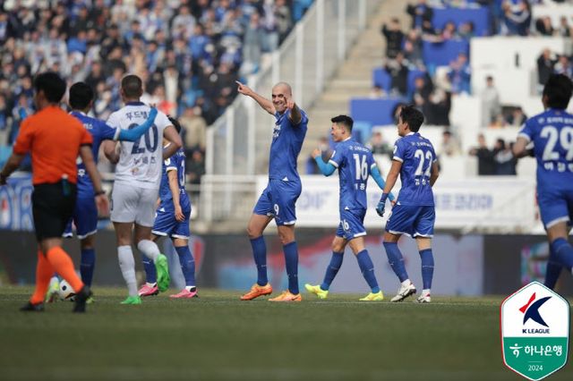 수원삼성은 3일 수원월드컵경기장에서 열린 하나은행 K리그2 2024 1라운드 안방 개막전에서 충남아산을 2-1로 꺾었다. 뮬리치가 2골을 넣으며 수적 열세에도 팀 승리를 이끌었다.
