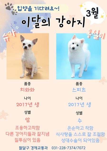 현재 팔달구 홈페이지 화면에서 ‘이달의 강아지’ 배너를 클릭하면 3월의 강아지 두 마리를 확인해 볼 수 있고 팔달구청 방문 시 팔달구청 1층에 있는 전자게시판에서도 확인할 수 있다.