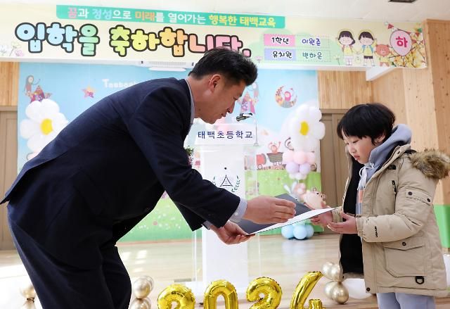 4日,位于江原道的太白小学举行2024学年度入学典礼,今年该校一年级新生仅为一人。图为新生李元俊(音)从校长手中接过入学通知书。