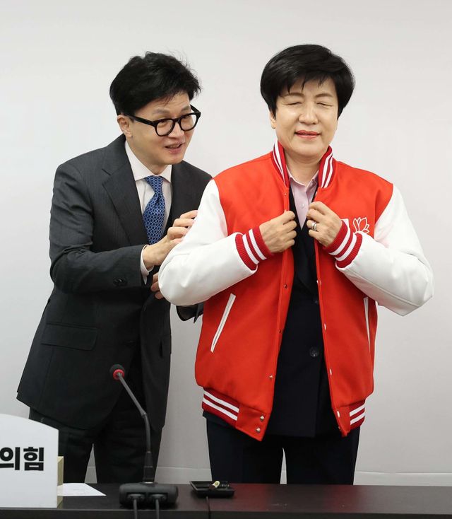 한동훈 국민의힘 비상대책위원장이 4일 오전 서울 여의도 국민의힘 중앙당사에서 열린 김영주 국회 부의장 입당식에서 당 점퍼를 입혀주고 있다. / 뉴스1(공동취재)
