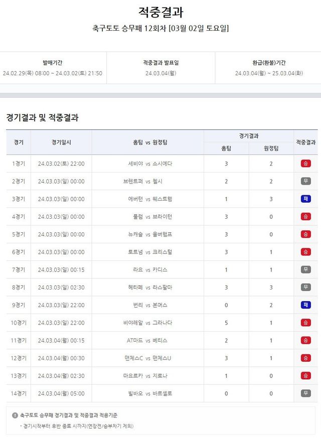 EPL 및 라리가 14경기 대상 축구토토 승무패 12회차 적중 결과 발표