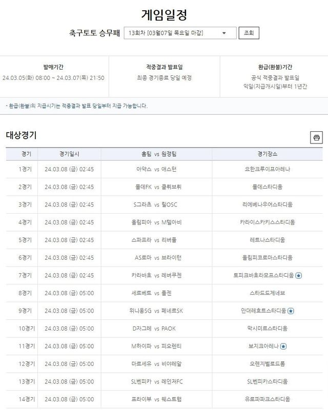 1등 적중 6건, 1인당 1억 2000여만원 수령 가능…축구토토 승무패 13회차 5일(화) 오전 8시부터 발매 개시