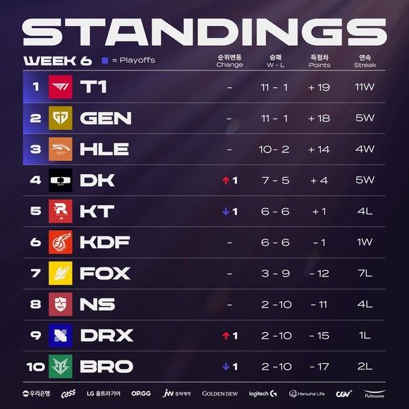 2024 LCK 스프링 6주차 팀 순위. ⓒ LCK