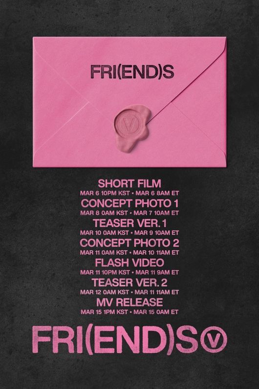 빅히트 뮤직은 5일 방탄소년단의 공식 SNS에 영문 'V' 인장이 찍힌 핑크색 편지봉투와 프로모션 콘텐츠 공개 일정이 담긴 ‘프렌즈’의 프로모션 스케줄을 게재했다.
