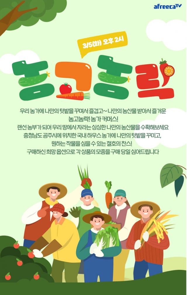 이날 오후 2시부터 시작하는 농고농락 라이브 커머스 방송에서는 아프리카TV 인기 스트리머 '레전드경선샘'과 '소대수캐스터'가 쇼호스트로 출연해 유저들에게 '마이트리' 하우스 내 마련된 미니 텃밭을 소개하고, 원하는 상품 패키지를 구매한 유저들의 닉네임을 팻말로 걸어줄 예정이다.