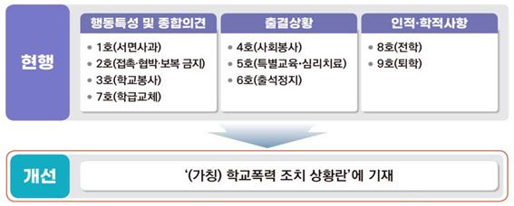 개정안은 3월 신학기부터 접수된 학폭 사안부터 적용된다. 학폭 가해로 출석정지(6호)·학급교체(7호)·전학(8호) 등 비교적 무거운 처분을 받게 되면 이에 대한 학생부 기록이 4년간 보존된다. 종전까지는 2년간 보존토록 했지만 앞으로는 이를 2배 연장토록 한 것이다.