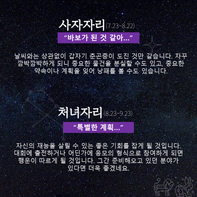 싱글인 분이라면 평범한 스타일보다는 개성이 강한 스타일과 연결될 확률이 높습니다. 사자자리와 잘 어울리는 때이니 참고하도록 하세요. 커플인 경우에는 만남을 미루는 것이 좋습니다. 너무 자주 만나는 것이 도움이 안 될 때도 있습니다.