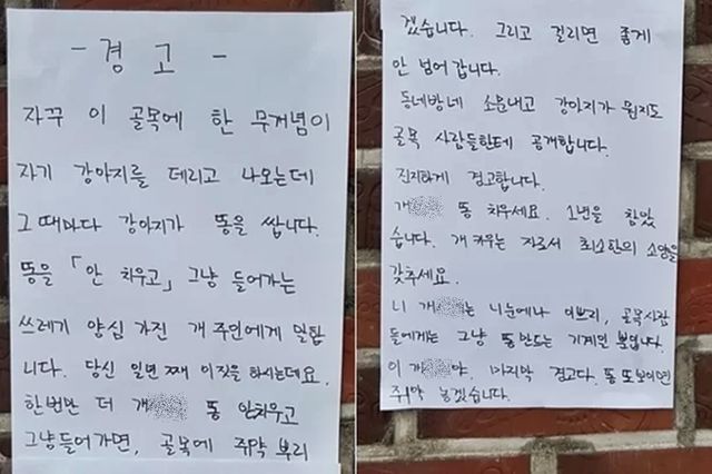 A 씨는 경고장을 통해 "자꾸 골목에 한 무개념 보호자가 강아지를 데리고 나온다. 그때마다 강아지가 똥을 싼다. 개똥을 안 치우고 그냥 가는 쓰레기 양심을 가진 보호자에게 말한다"고 운을 뗐다.
