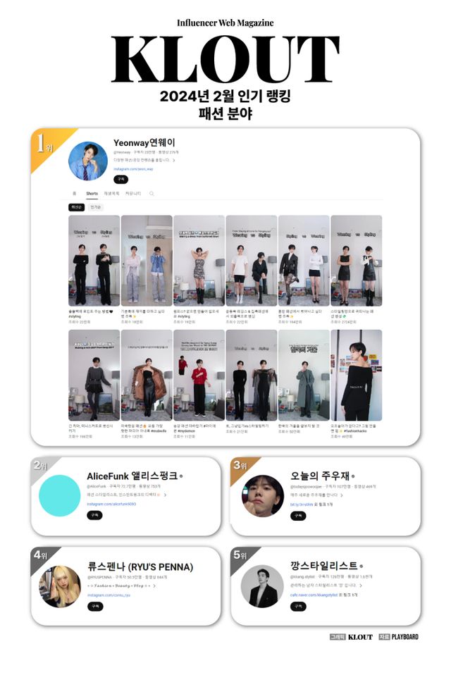 한편 2위는 앨리스펑크 대표이자 패션 스타일리스트인 김지혜 디렉터의 '앨리스펑크'(AliceFunk), 3위 모델 겸 방송인 주우재가 운영하는 '오늘의 주우재', 4위 글로벌 MCN기업 트레져헌터 소속 패션 및 뷰티 크리에이터 '류스펜나'(RYU'S PENNA), 5위는 남성 패션을 중심으로 다양한 스타일링 콘텐츠를 제작하는 '깡스타일리스트'가 랭크됐다.