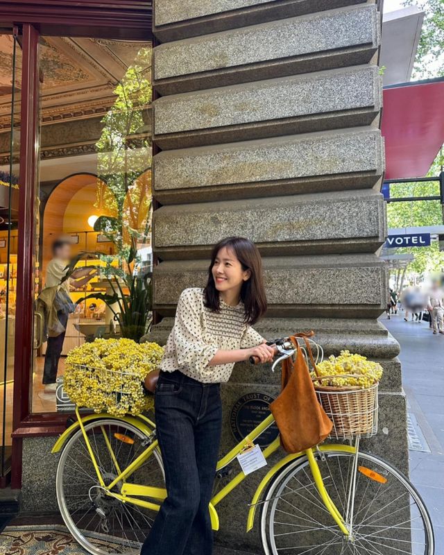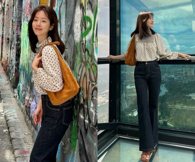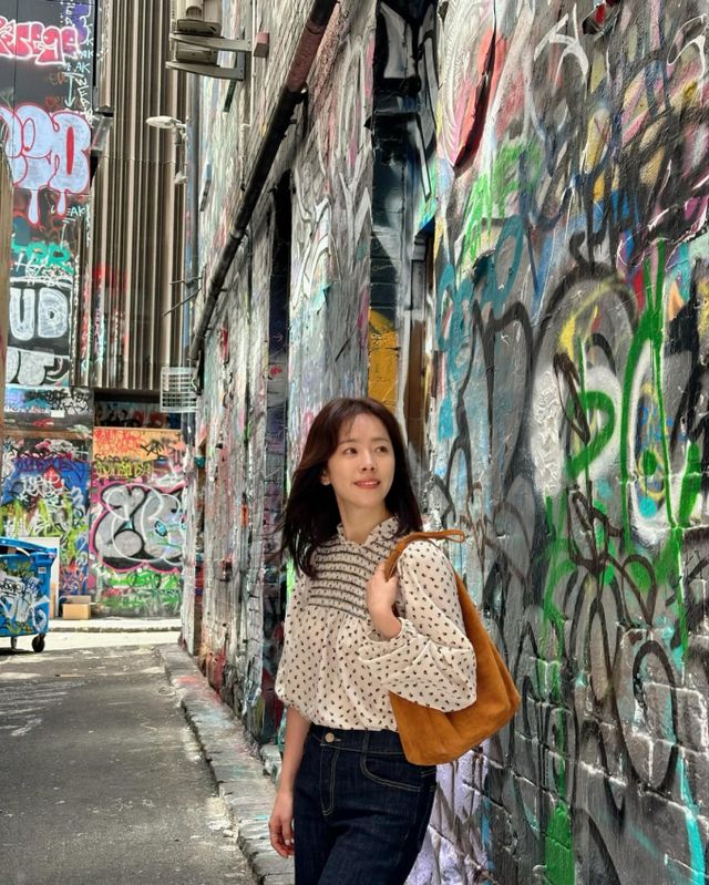 공개된 사진 속 한지민은 호주 멜버른의 거리에서 포즈를 취하고 있다.